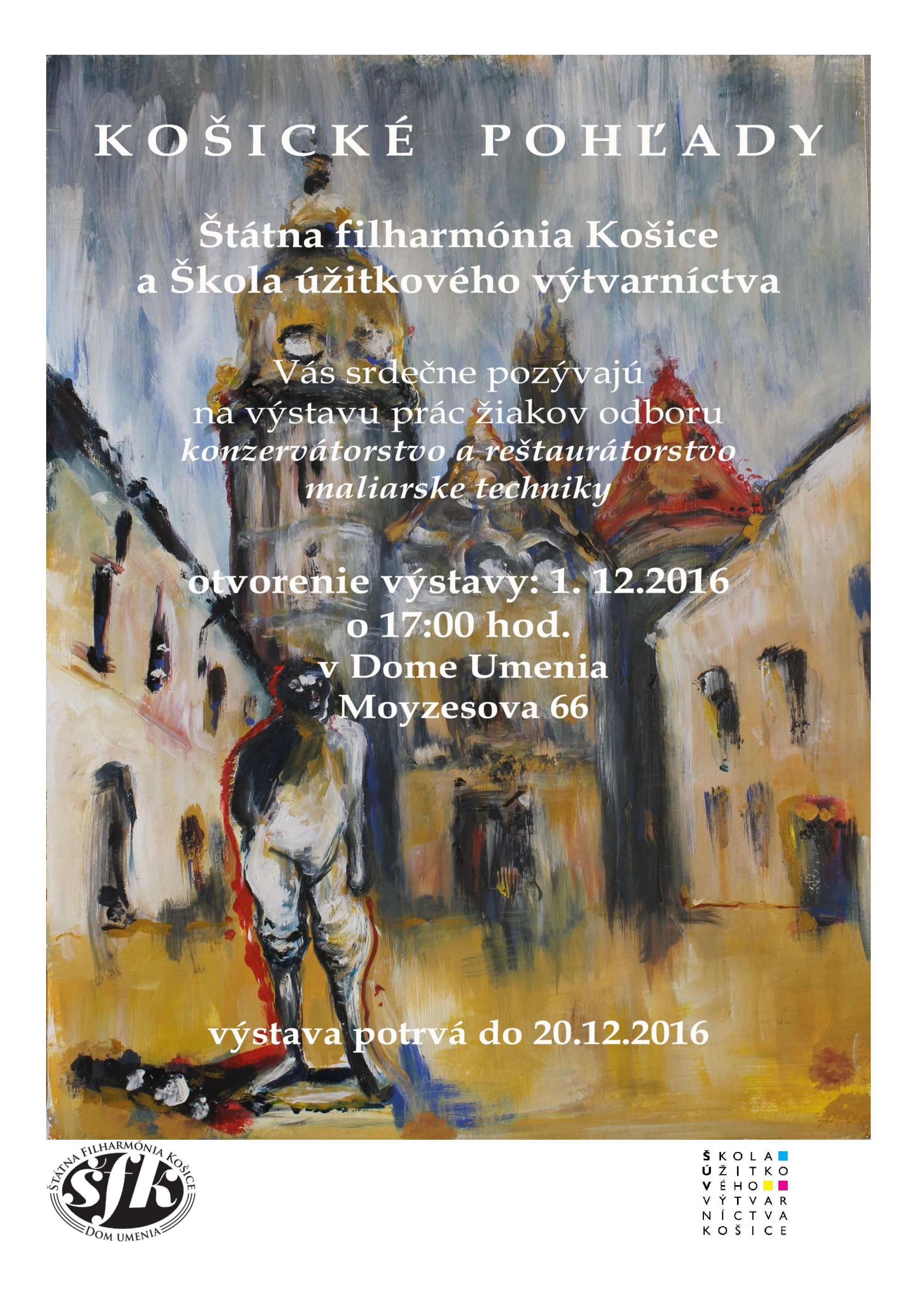 Študenti Školy úžitkového výtvarníctva Košice budú opäť vystavovať v Dome umenia. 1. decembra 2016 začína výstava s názvom "Košické pohľady". V tejto predvianočnej výstave budú prezentované práce tematicky súvisiace s metropolou východu. „Počas niekoľkých rokov naši žiaci vytvárali olejomaľby - invenčné kópie s košickými pohľadmi, ktoré v podobe súčasnej kolekcie budú po prvý krát verejne prezentované. Známe i menej známe košické zákutia a ulice sú namaľované vždy v rukopise umelca, ako napríklad majstra Jakobyho alebo Moneta, Ernsta, či Turnera," tvrdí organizátor výstavy a pedagóg ŠÚV Košice Mgr.art. Milan Špak, Art.D.