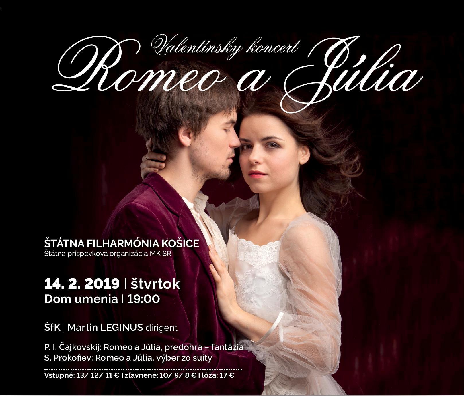Tohtoročný Valentínsky koncert Štátnej filharmónie Košice je inšpirovaný nesmrteľnou láskou Shakespearovho príbehu Romea a Júlie. Prokofievov rovnomenný balet je veľkolepou oslavou lásky, ktorej sila vzdoruje predsudkom a nenávisti, a i keď bol v čase svojho vzniku prijatý s nepochopením, dnes patrí k najhrávanejším a najobľúbenejším baletným titulom. Prokofiev v ňom rozvíja Shakespearovu drámu presne podľa predlohy. Obľube sa dielo teší aj na koncertných pódiách – sám Prokofiev vytvoril tri symfonické suity, v ktorých použil tie najpresvedčivejšie čísla z baletnej predlohy. Viaceré z nich pri tom pretvoril tak, že sa v koncertnej verzii úplne líšia. Býva zvykom, že na koncertoch sa tieto tri suity často kombinujú a vytvárajú sa tak nové zoskupenia jednotlivých častí. Podobne tomu bude aj v Košiciach na koncerte pod taktovkou Martina Leginusa