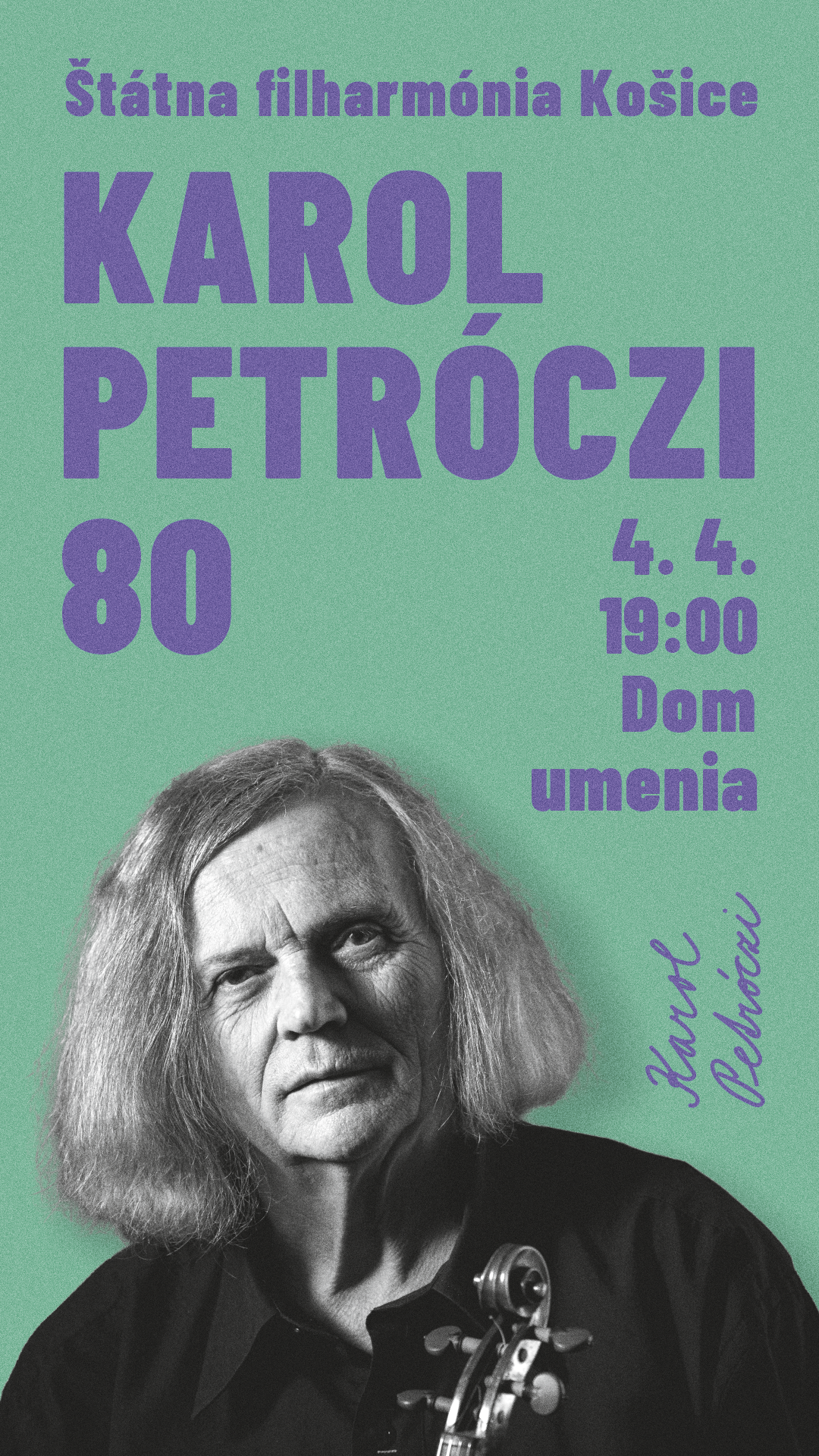 Štátna filharmónia Košice pozýva na komorný koncert KAROL PETRÓCZI 80. Zámerom podujatia je oslava jubilea významnej slovenskej umeleckej osobnosti, interpreta a pedagóga, zakladajúceho člena a dlhoročného koncertného majstra ŠFK Karola Petrócziho. Účinkovať budú niektorí z jeho najúspešnejších študentov a ich hostia. Program je pestrou hudobnou prehliadkou rôznych období a žánrov. Komorný koncert sa uskutoční 4. apríla 2024 o 19:00 v Dom umenia. Podujatiu bude predchádzať predkoncertné stretnutie o 18:00 s oslávencom a lektorom dramaturgie Petrom Katinom.
