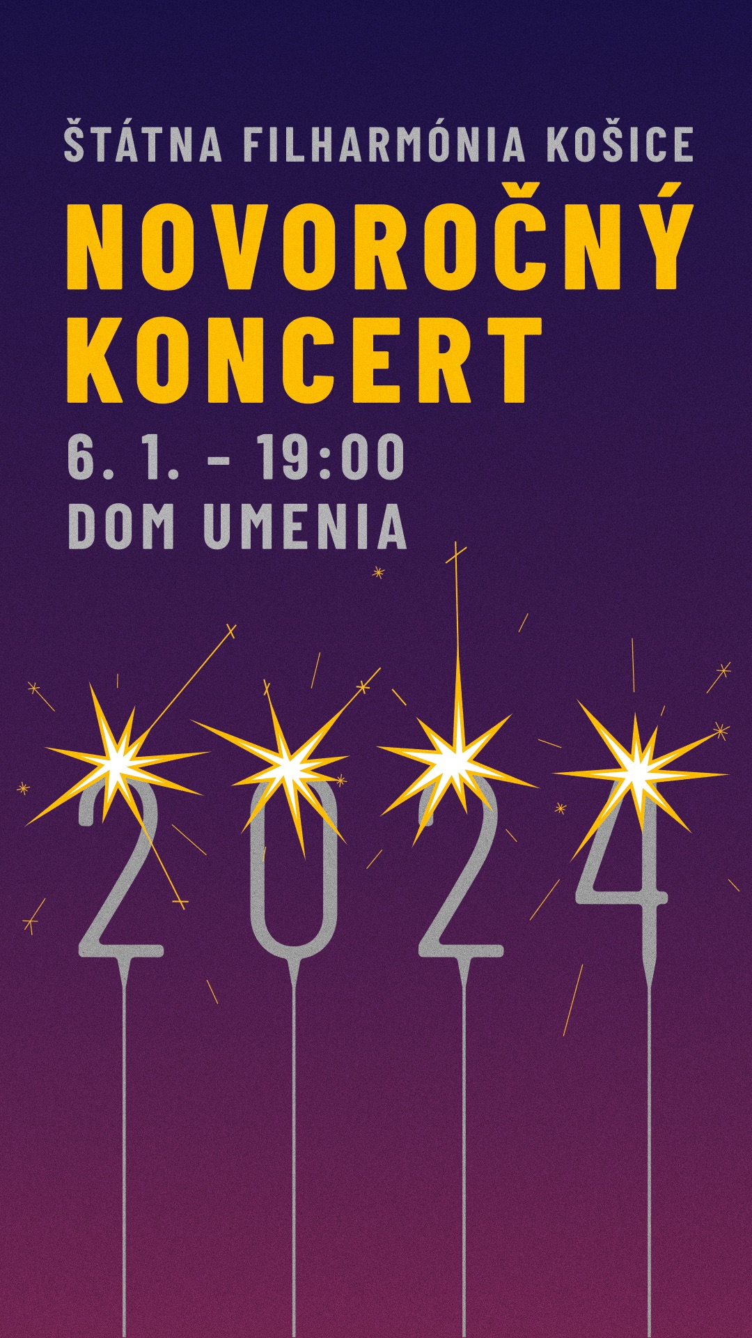 Novoročný koncert sa uskutoční 6. januára 2024 o 19:00 v Dome umenia. Cena vstupného je 20/18/16 € – zľavnené 17/15/13 € – lóža 24 €. Vstupenky na podujatia Štátnej filharmónie Košice sú v predaji aj so zľavami vo vstupenkovej pokladnici Domu umenia od pondelka do štvrtka (10:00 – 12:00, 14:00 – 17:00) a hodinu pred podujatím. Vstupenky sú v predaji aj online na webe Štátnej filharmónie Košice www.sfk.sk alebo cez link https://program-sfk.colosseum.eu/. Zľavy je možné uplatniť aj pri online nákupe.