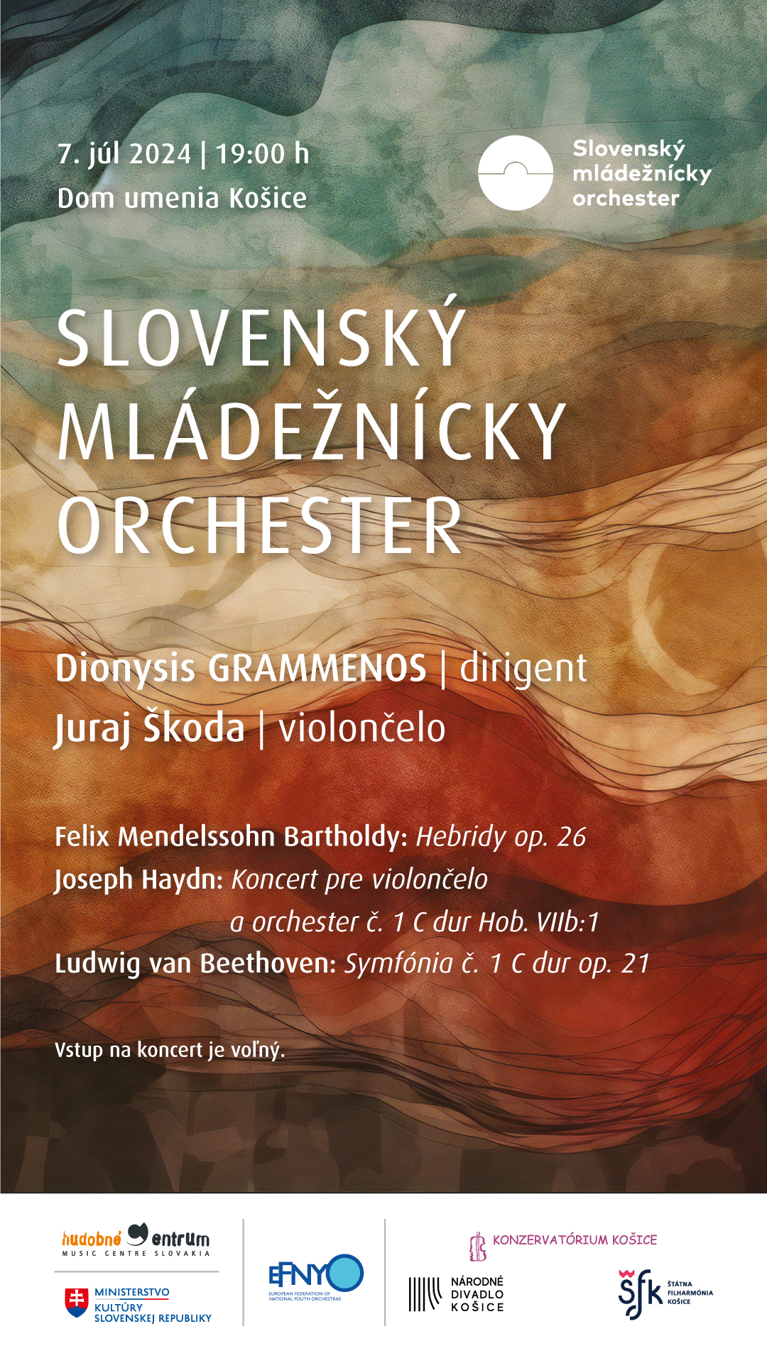 Túto nedeľu o 19:00 si v Dome umenia môžete vypočuť diela Mendelssohna-Bartholdyho, Haydna i Beethovena. Na pódium sa posadí generácia študentov konzervatórií a vysokých hudobných škôl pod hlavičkou Slovenského mládežníckeho orchestra. Povedie ich dirigent Dionysis Grammenos, sólovo sa predstaví violončelista Juraj Škoda. Koncert bude ovocím letného sústredenia mládežníckeho telesa, skúsenosti hudobným nádejam odovzdávajú aj košickí filharmonici. Vstup na podujatie je zdarma.