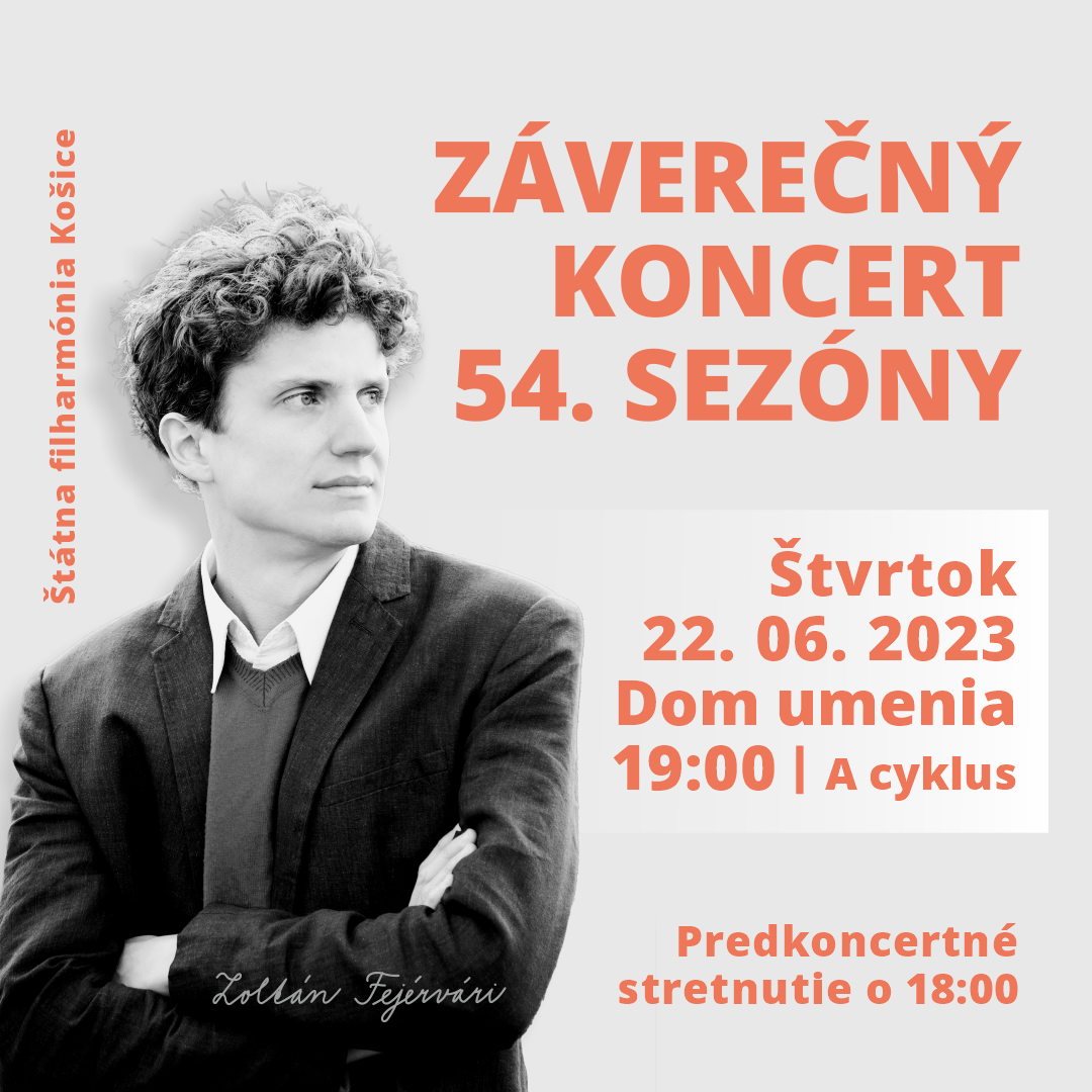 ZÁVEREČNÝ KONCERT 54. SEZÓNY z abonentného A cyklu sa uskutoční vo štvrtok 22. júna 2023 o 19:00 v Dome umenia. Podujatiu predchádza verejná generálka o 10:00 a predkoncertné stretnutie o 18:00. Cena vstupného je 12/11/10 €, zľavnené 9/8/7 €, lóža 16 €. Vstupenky na podujatia Štátnej filharmónie Košice sú v predaji aj so zľavami vo vstupenkovej pokladnici Domu umenia od pondelka do štvrtka (10:00 – 12:00, 14:00 – 17:00) a hodinu pred podujatím. Vstupenky sú v predaji aj online na webe Štátnej filharmónie Košice alebo cez link https://program-sfk.colosseum.eu/. Zľavy je možné uplatniť aj pri online nákupe.