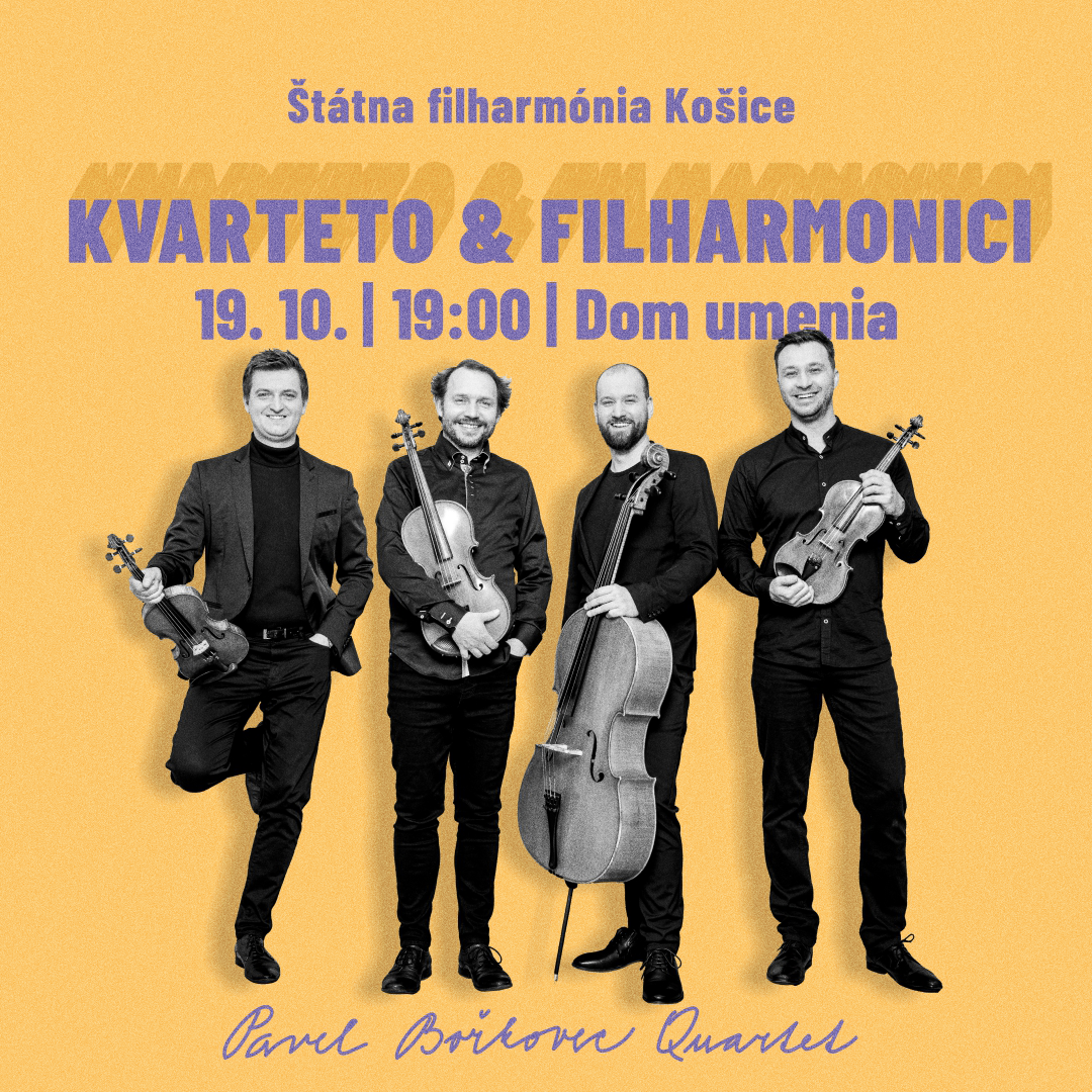 V poradí druhý abonentný koncert 55. sezóny prinesie návštevníkom zaujímavú a netradičnú kombináciu. Štátna filharmónia Košice totiž do úlohy sólistov tentoraz obsadila štvorčlenné inštrumentálne teleso. Na koncerte KVARTETO & FILHARMONICI vystúpi Pavel Bořkovec Quartet. Pod taktovkou šéfdirigenta Roberta Jindru odznejú diela Jána Cikkera, Bohuslava Martinů a Johannesa Brahmsa. Koncert A cyklu sa uskutoční vo štvrtok 19. októbra 2023 o 19:00 v Dome umenia.