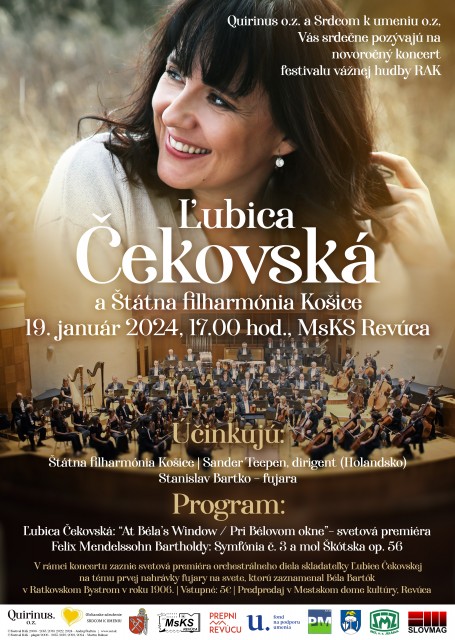 Quirinus, o.z. a Srdcom k umeniu, o.z. vás srdečne pozývajú na koncert Štátnej filharmónie Košice, v rámci ktorého odznie svetová premiéra skladby Pri Bélovom okne slovenskej hudobnej skladateľky Ľubice Čekovskej. Skladba vznikla na motívy fujarovej melódie, ktorú nahral v roku 1906 v gemerskej obci Ratkovské Bystré maďarský skladateľ Béla Bartók. Genéza vzniku Čekovskej skladby je o to výnimočnejšia, že podľa viacerých odborníkov ide podľa súčasného stavu poznania o prvú/najstaršiu zvukovú nahrávku fujary na svete. V Čekovskej skladbe Pri Bélovom okne sa tak snúbi súčasná klasická hudba, história slovenského regiónu Gemer a systematická dlhodobá vedecko-výskumná činnosť zameraná na tento región, ktorá bola realizovaná pod gesciou interdisciplinárnej vedeckej konferencie organizovanej občianskym združením Quirinus. Autorom myšlienky skomponovania diela na túto tému je organológ Dr. Andrej Štafura, na spomenutú dobovú nahrávku, ktorá je v zbierkovom fonde Néprajzi Múzeum Budapest (Etnografické múzeum Budapešť), poukázala muzikologička Dr. Marianna Bárdiová. Dielo odznie vo svetovej premiére 18.1.2024 v Štátnej filharmónii Košice (19.00 hod.) a 19.1.2024 v Mestskom dome kultúry v Revúcej (17.00 hod.), kde bude súčasťou koncertu aj uvádzaná dobová nahrávka a fujarové sólo Stanislava Bartka.