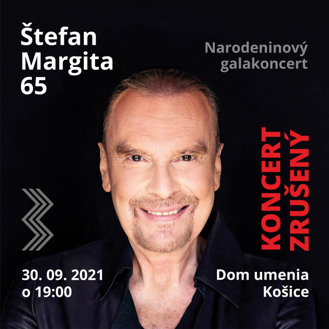 Štátna filharmónia Košice (ŠfK) s poľutovaním oznamuje zrušenie koncertu ŠTEFAN MARGITA 65, ktorý sa mal uskutočniť dňa 30. 09. 2021 v Dome umenia. Príčinou zrušenia sú vážne rodinné dôvody pána Štefana Margitu.